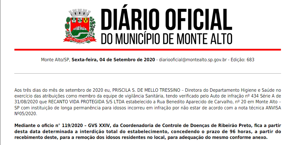 Vigilância Sanitária de Ribeirão orienta interdição de Instituição de idosos Estabelecimento pode solicitar a reativação das atividades, mediante providências e cumprimento das legislações pertinentes 4 de setembro de 2020