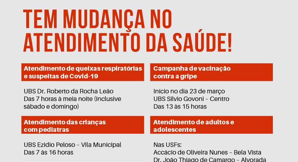 O prefeito João Paulo Rodrigues anunciou as seguintes mudanças nos atendimentos das Unidades de Saúde do município, válidas…