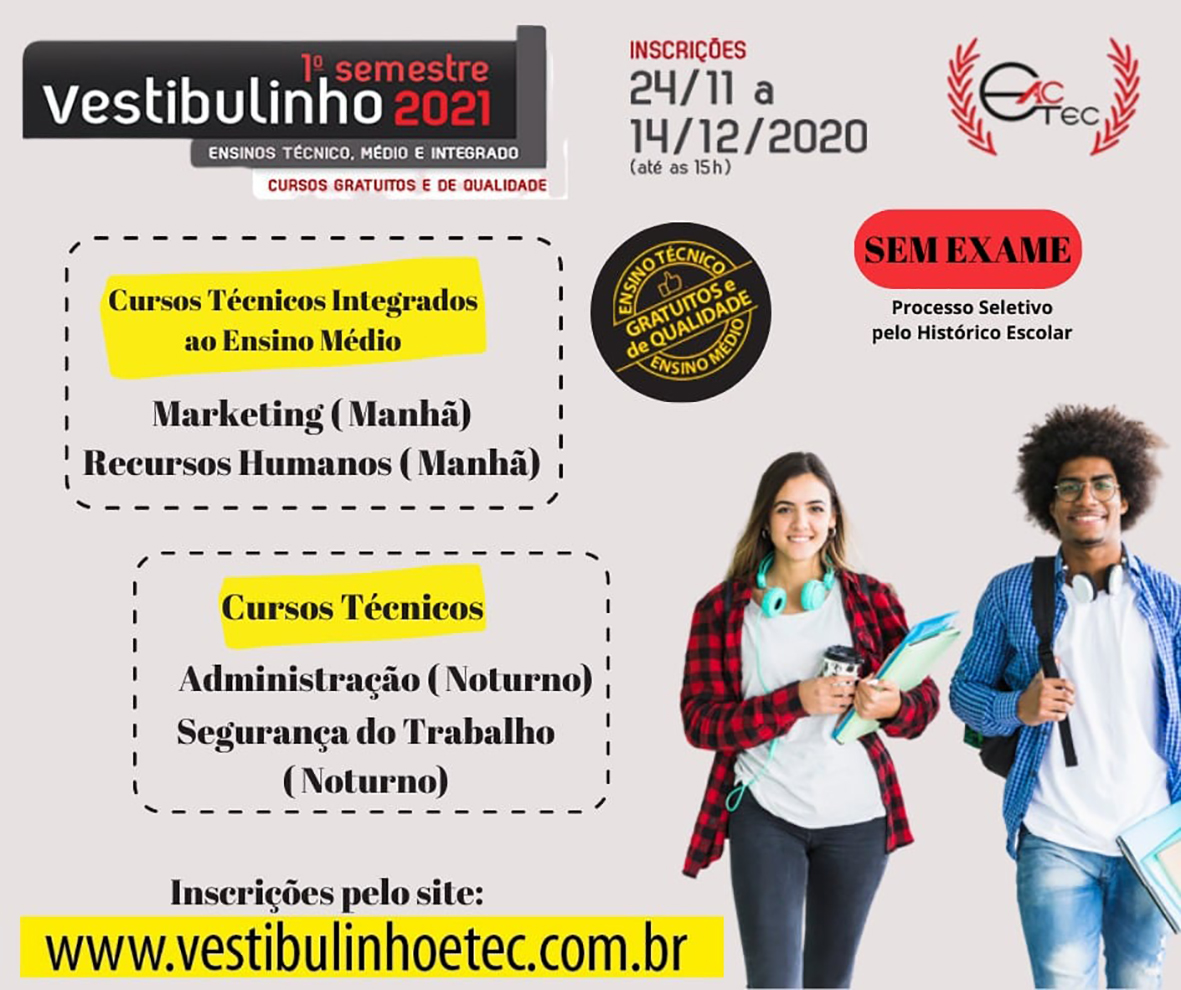 Inscrições para Vestibulinho das ETECs estão abertas Quatro cursos estão disponíveis na unidade montealtense “Alcides Cestari” 27 de novembro de 2020