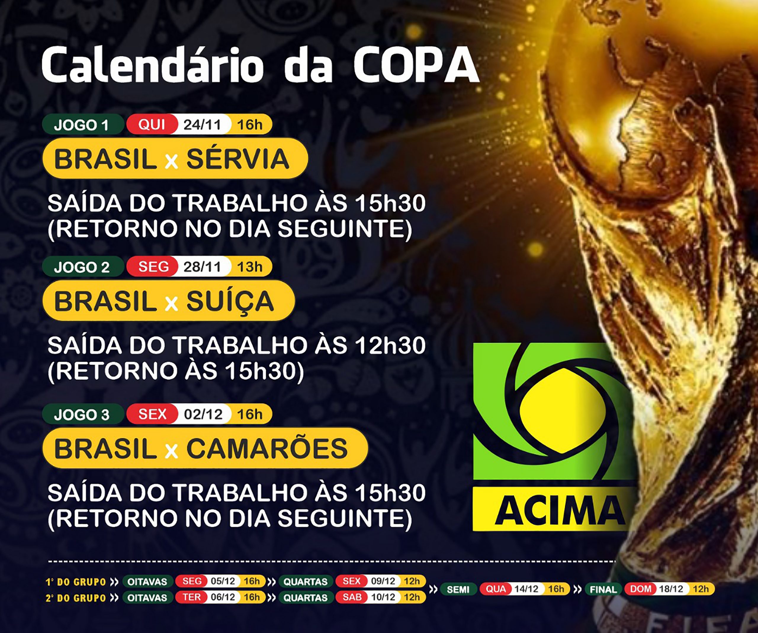 ACIMA define horário do comércio em dias de jogos do Brasil na Copa do Mundo Primeiro jogo da seleção é no dia 24 de novembro; final será em 18 de dezembro 4 de novembro de 2022