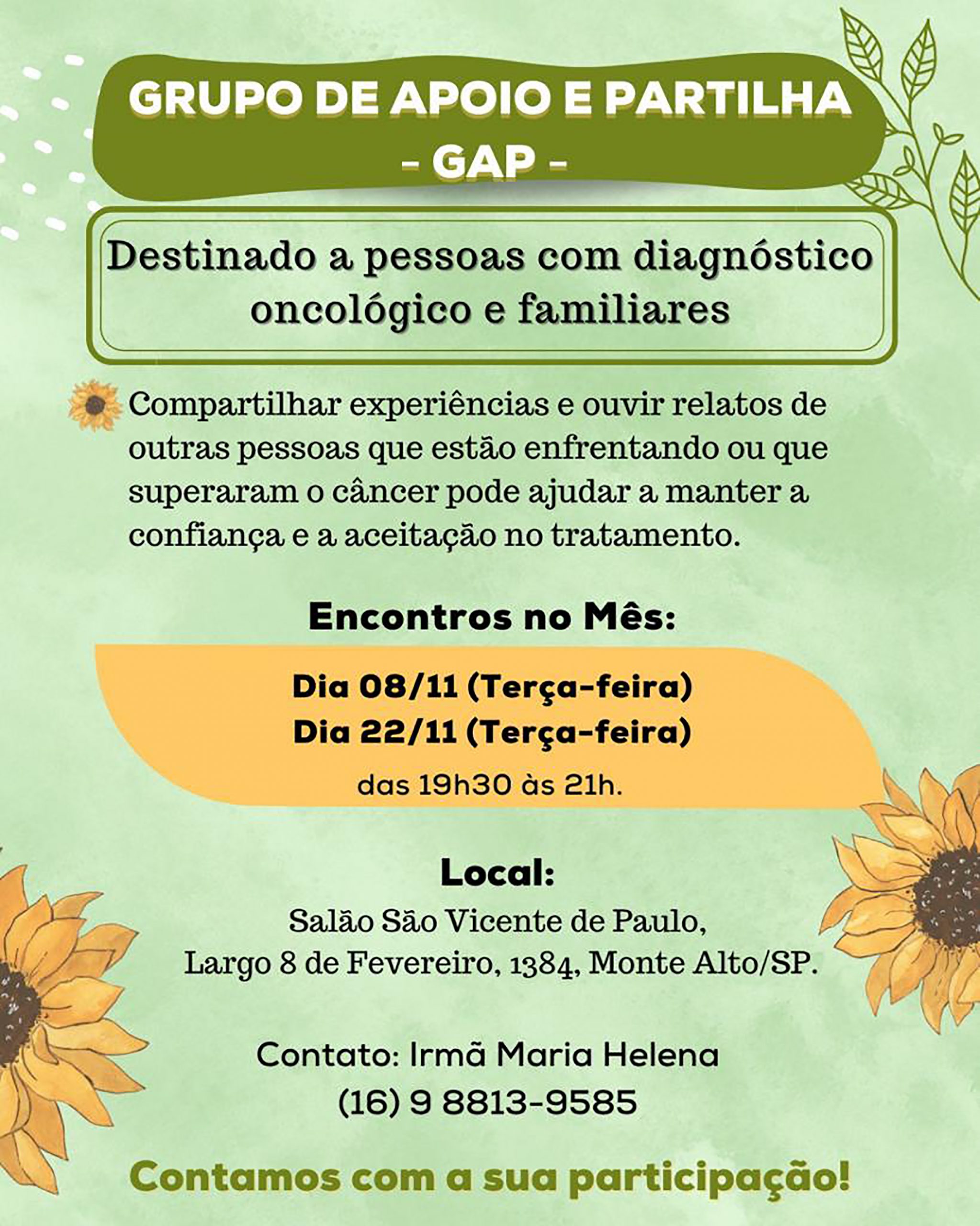 Montealtense cria Grupo de Apoio e Partilha para pessoas em tratamento de câncer Encontros são realizados quinzenalmente no salão do Lar São Vicente de Paulo, às 19h30 4 de novembro de 2022