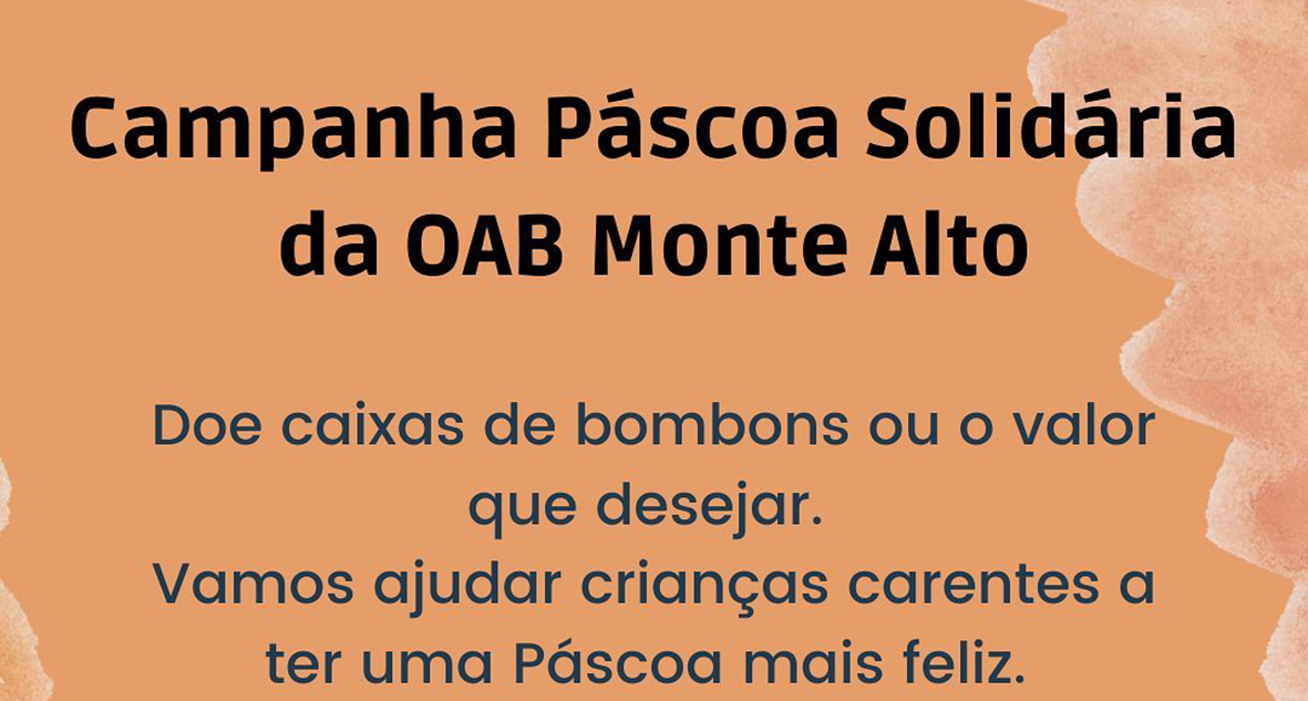 OAB Monte Alto dá início à campanha Páscoa Solidária Doações podem ser feitas em produtos, dinheiro ou PIX 25 de março de 2022