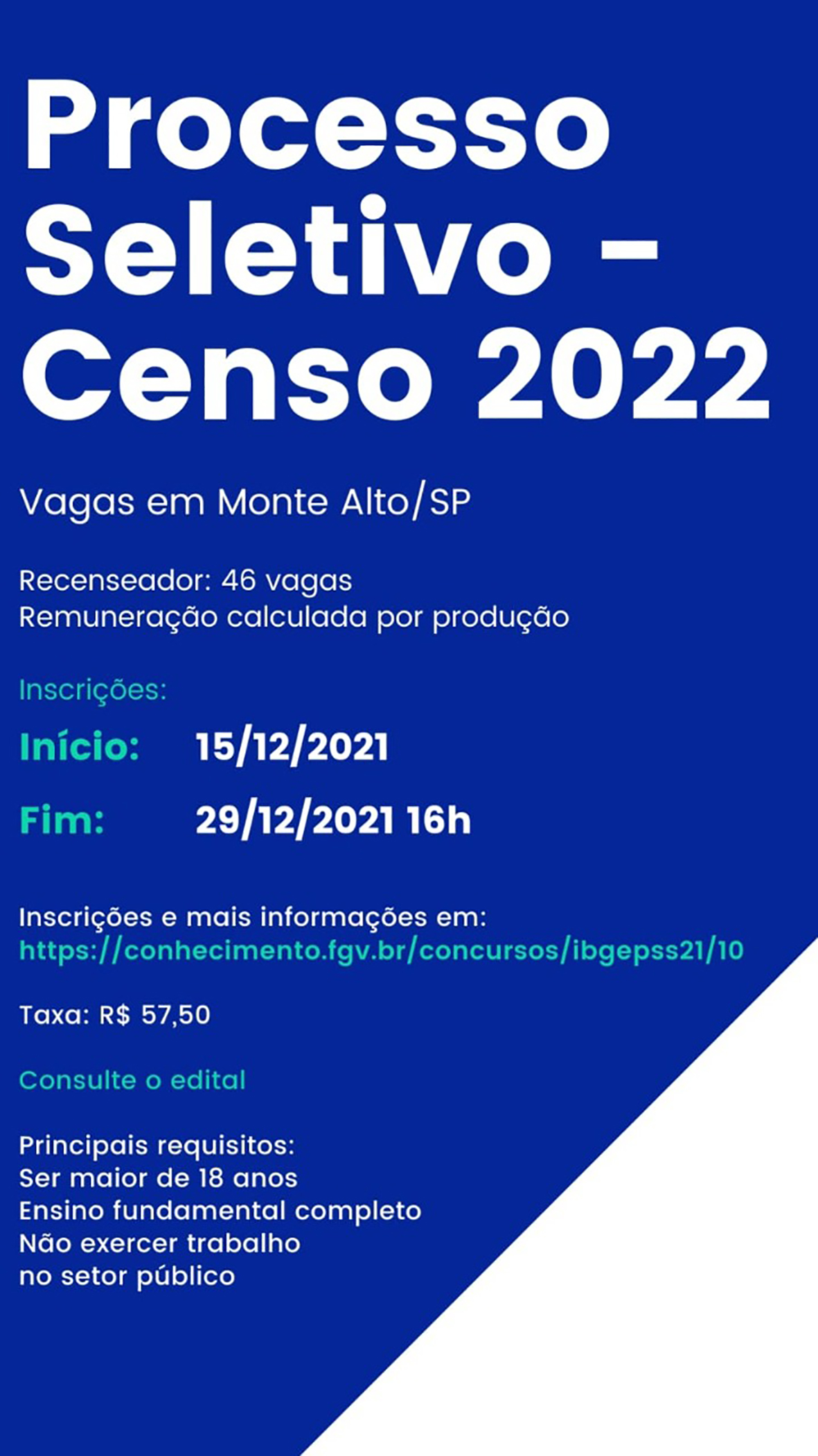 IBGE abre dois processos seletivos com mais de 200 mil vagas para o Censo 2022 Monte Alto contará com 46 vagas para recenseador e outras sete para o cardo de Agente Censitário 23 de dezembro de 2021