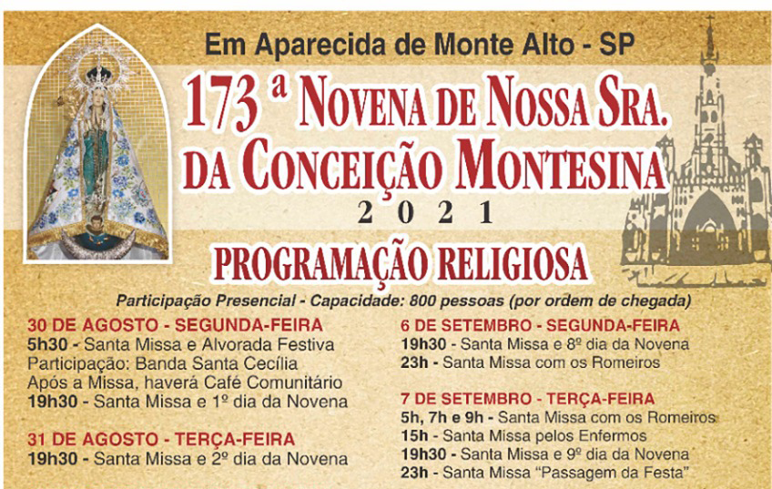 Santuário de Aparecida de Monte Alto se prepara para a novena de Nossa Sra. da Conceição Montesina 173ª novena tem programação religiosa e venda antecipada de galinhada, além do café para os peregrinos 27 de agosto de 2021