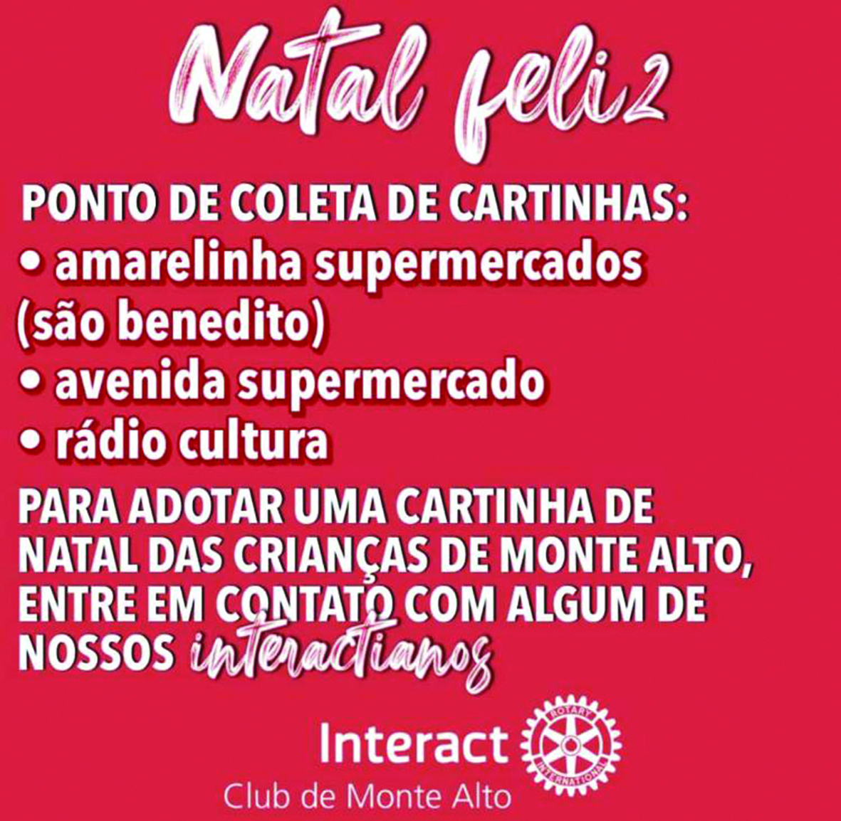 Interact Club inicia projeto “Natal Feliz” Doações de brinquedos, alimentos, roupas, e demais itens, podem ser entregues diretamente na sede do Rotary Club 7 de dezembro de 2019