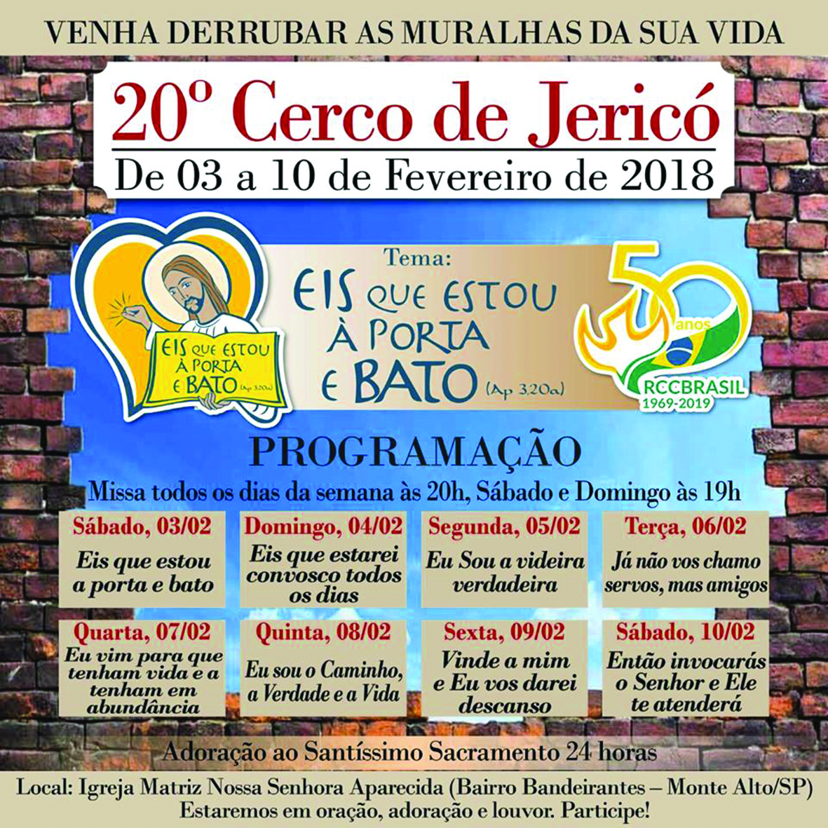 Comunidade N. S. Aparecida anuncia 20º Cerco de Jericó Missas serão às 19 horas, nos finais de semana e às 20 horas durante a semana 2 de fevereiro de 2018