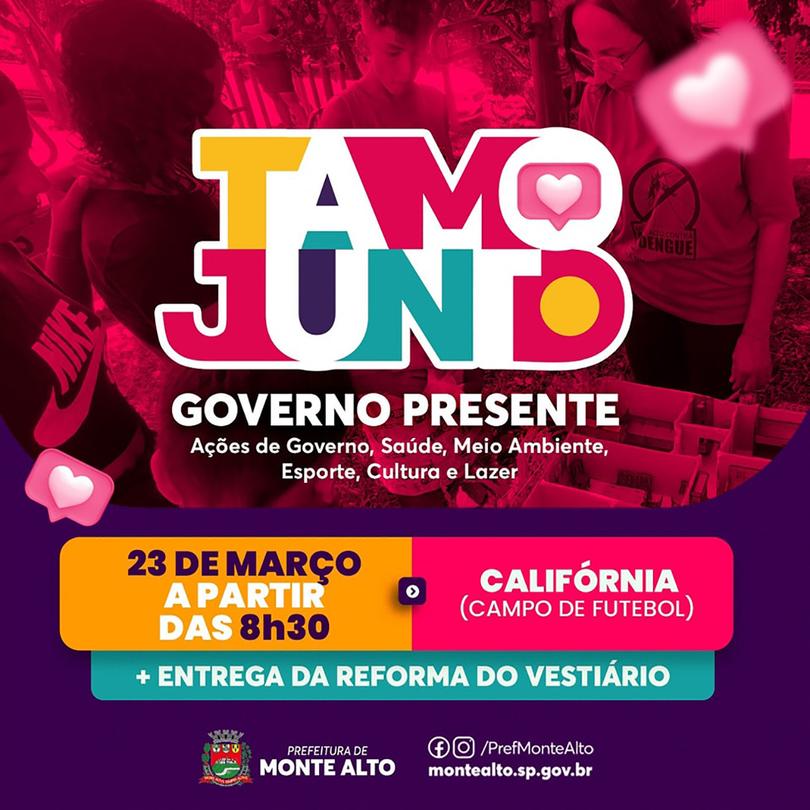6º ‘#TamoJunto Governo Presente’ chegará ao Jardim Califórnia neste sábado Atividades de várias áreas da Administração serão oferecidas à comunidade, como em edições anteriores 22 de março de 2024