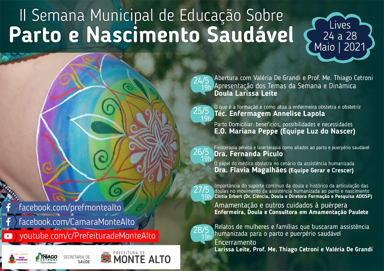 Semana educativa tem como foco Parto e Nascimento Saudável Transmissões ao vivo acontecem a partir de hoje, dia 24, até sexta-feira nas redes sociais da Prefeitura e da Câmara Municipal 24 de maio de 2021