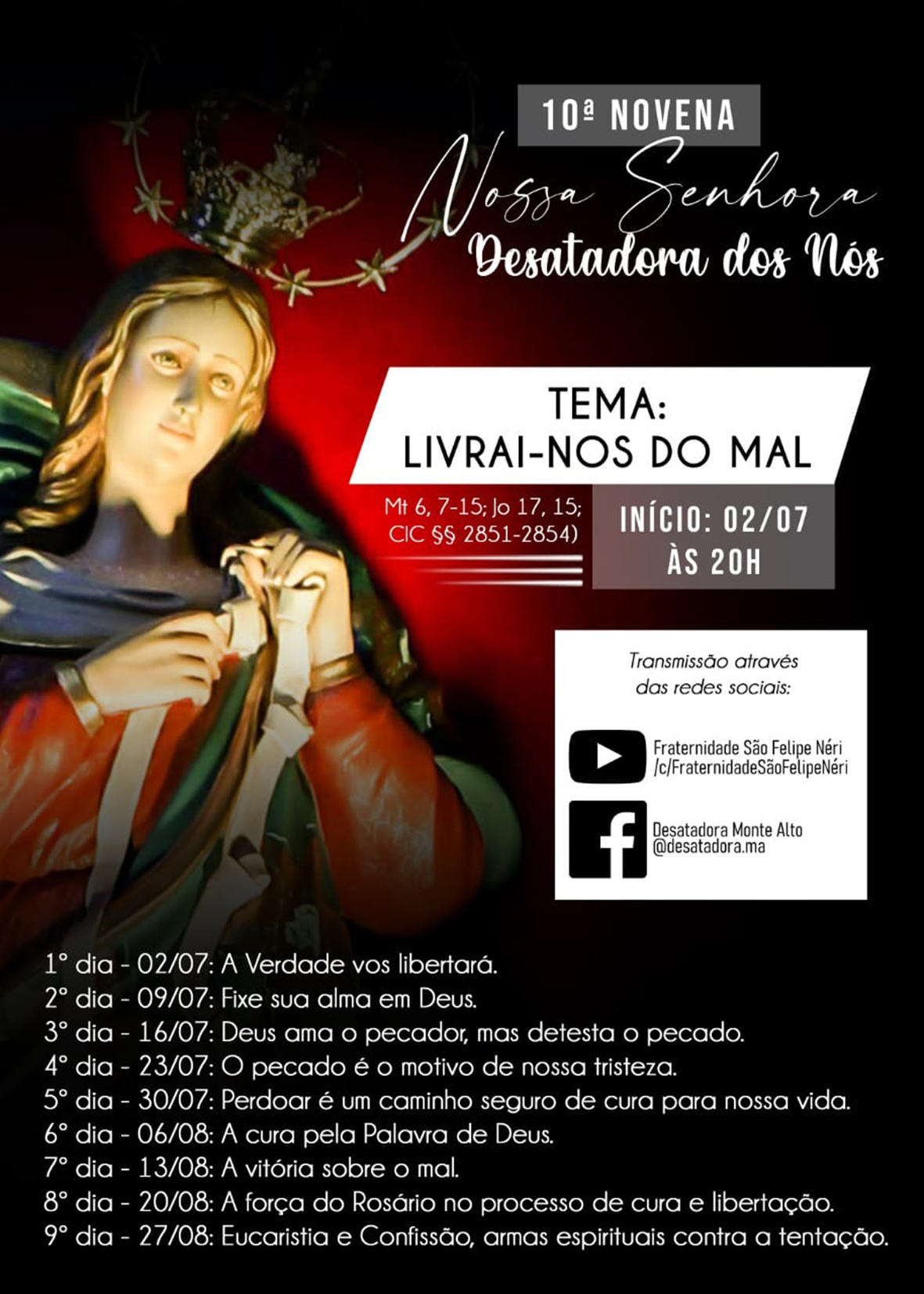 Paróquia anuncia novena de Nossa Senhora Desatadora ‘Livrai-nos do mal’ será o tema da 10ª edição da novena, que mais uma vez será realizada sem presença de fiéis; transmissão será pelas redes sociais 4 de junho de 2021