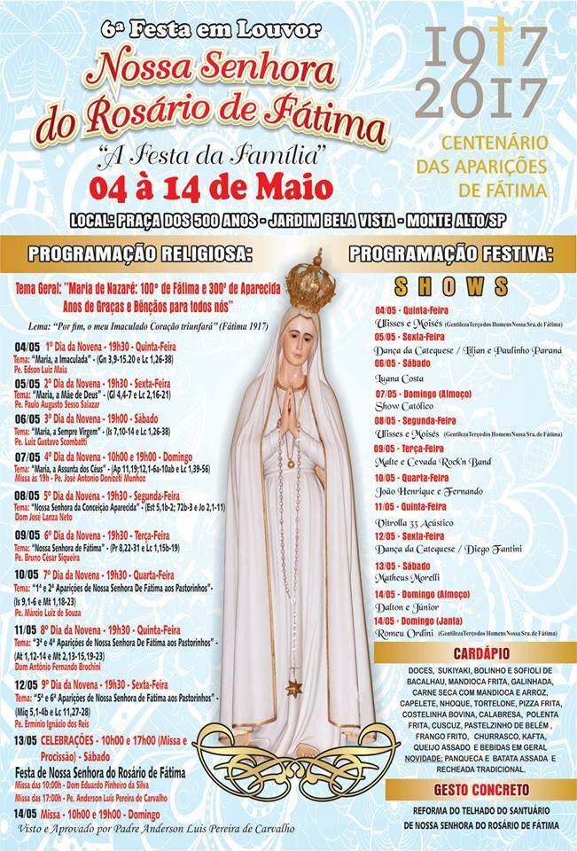 Comunidade prepara festa de Nossa Senhora de Fátima Programação religiosa lembrará os 100 anos da aparição de Nossa Senhora de Fátima e os 300 anos da aparição de Nossa Senhora Aparecida 3 de maio de 2017
