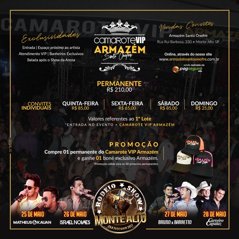 Armazém anuncia “Camarote Vip” no Rodeio de Monte Alto Permanente, em primeiro lote, custa R$ 210,00 20 de abril de 2017