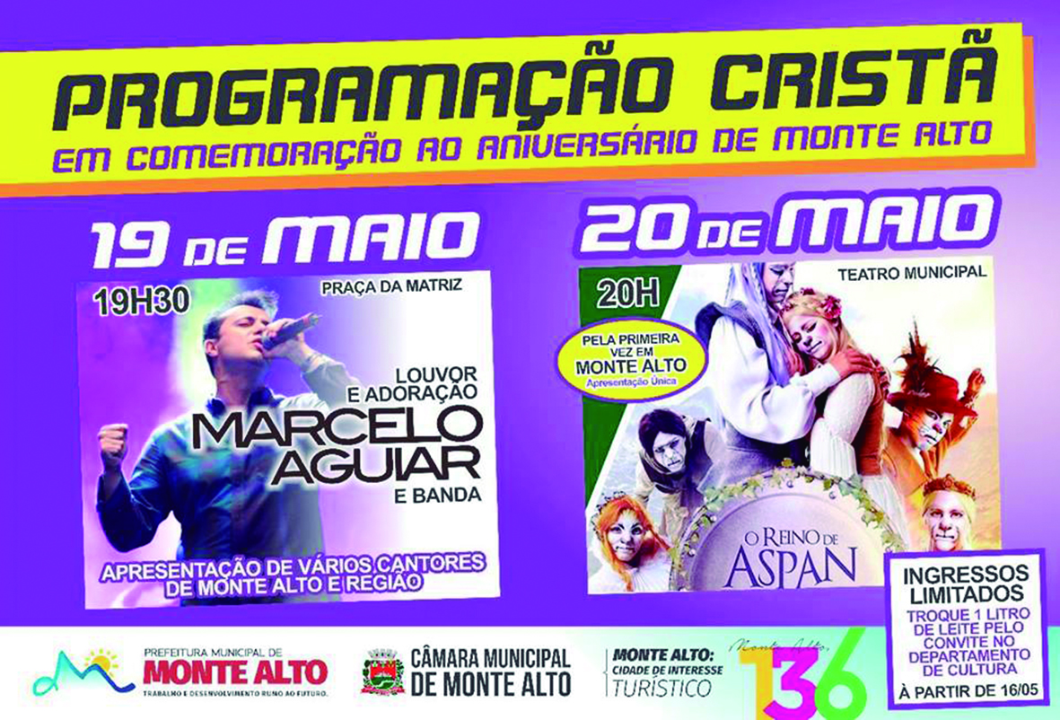 Eventos cristãos complementam aniversário de Monte Alto Show de Marcelo Aguiar, na Praça Central e teatro “O Reino de Aspan”, no Cine-Teatro Municipal, acontecem hoje e amanhã 19 de maio de 2017