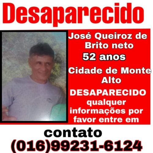 Continuam as buscas por José Queiroz de Brito Neto, desaparecido há 6 dias Brigada de Monte Alto intensificou ações próximo do local onde sua moto foi localizada 16 de julho de 2019