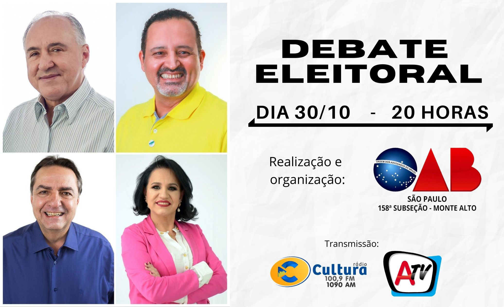 Debate Eleitoral: Candidatos apresentam suas propostas na noite de hoje Evento terá transmissão pela Rádio Cultura e redes sociais da Alternativa TV 30 de outubro de 2020