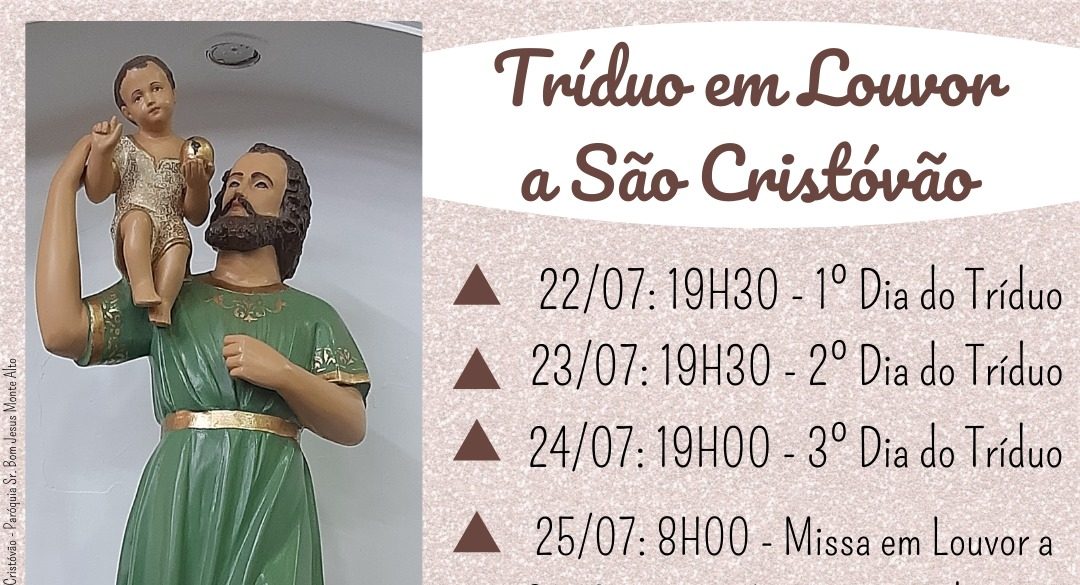 Paróquia Senhor Bom Jesus celebra Tríduo em Louvor a São Cristóvão Missas presenciais poderão acontecer com 40% da ocupação; últimos dias serão transmitidos ao vivo 22 de julho de 2021
