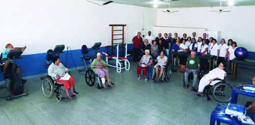 Rotarianos, moradores e funcionários do Lar São Vicente de Paulo na completa sala para atendimentos de fisioterapia