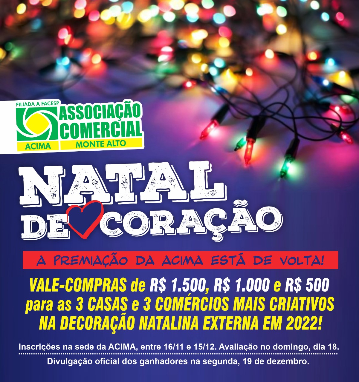 Concurso de decoração natalina da ACIMA está de volta > Inscrições começam na próxima semana. Avaliação será feita por Comissão, no dia 18 de dezembro, com resultado… 10 de novembro de 2022