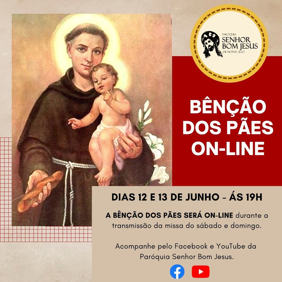 Benção dos Pães Nos próximos 12 e 13 de junho, a paróquia do Senhor Bom Jesus realizará a bênção dos pães,… 11 de junho de 2021
