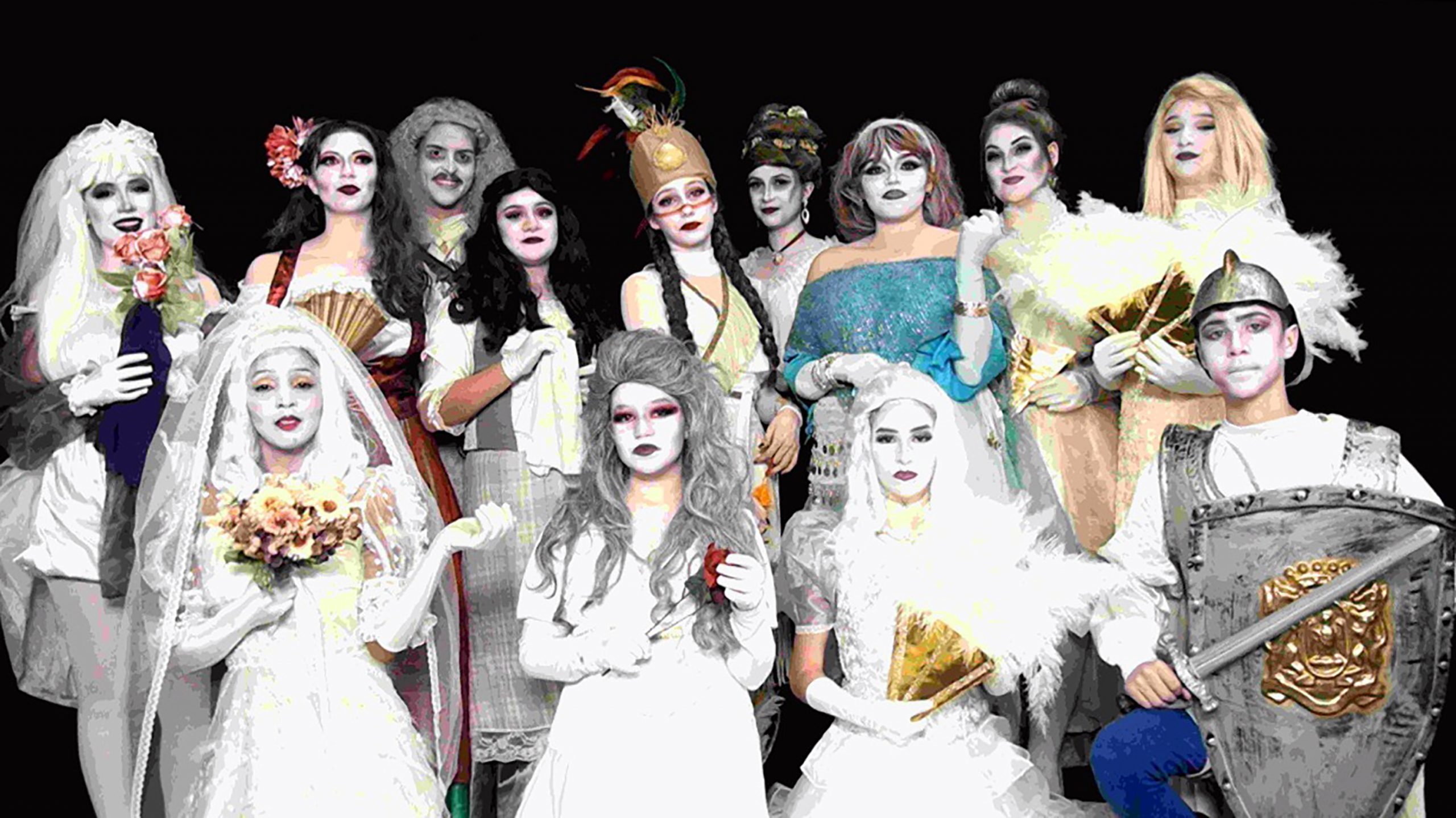 Elenco caracterizado como seus personagens para a próxima peça da Cia.