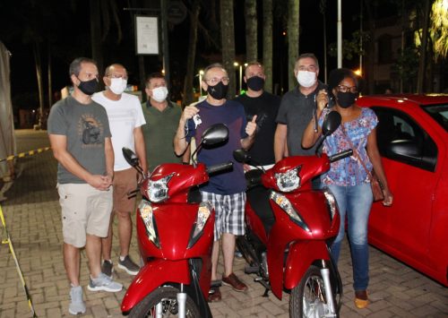 Os ganhadores das motos: João Edimar da Silva, que comprou na Comander Calçados e Marcia Andreia de Souza Cune, que comprou na Nenus Perfumaria