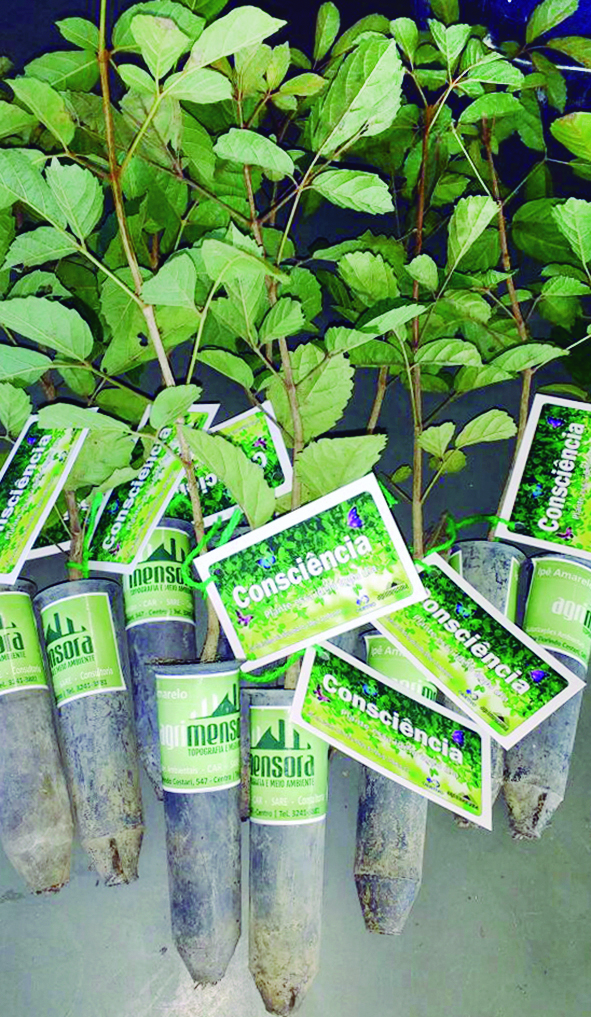 Mudas que foram entregues aos alunos do 4º ano com a inscrição “CONSCIÊNCIA – Plante essa ideia”