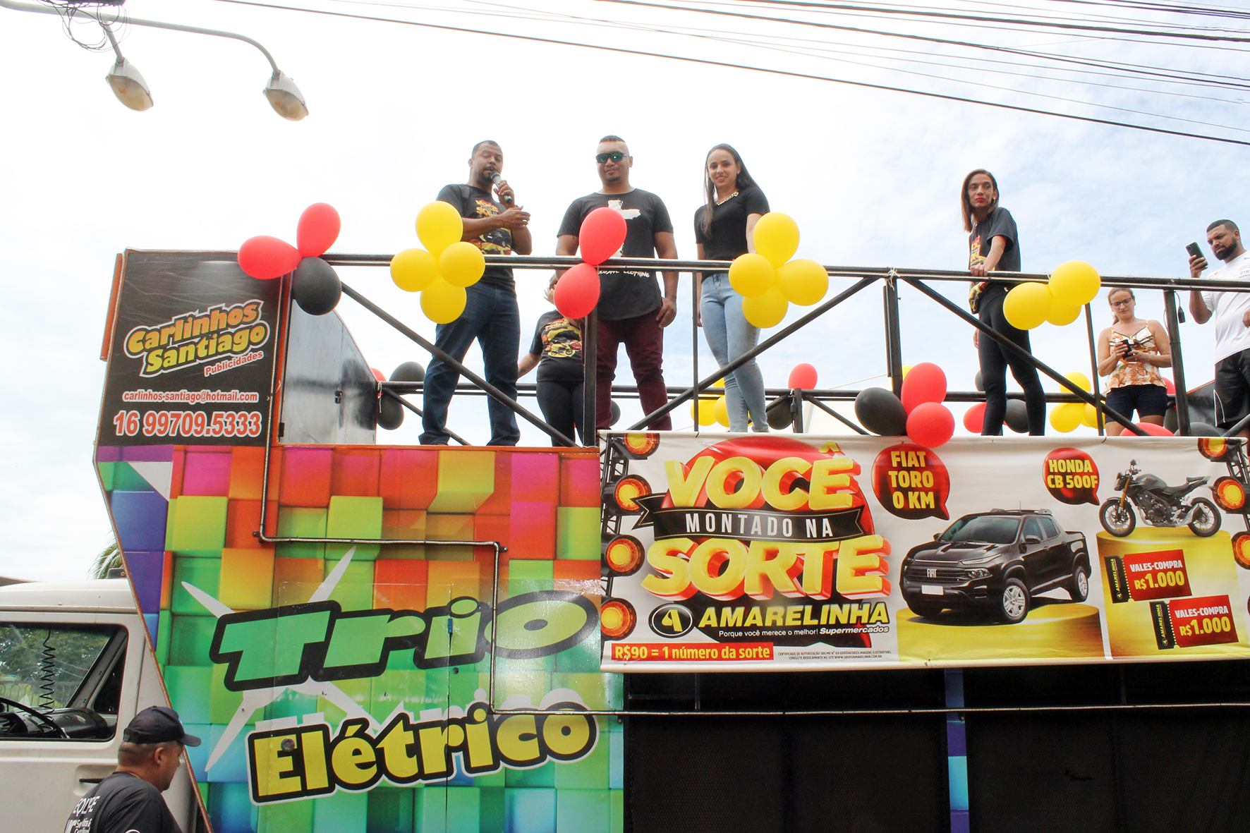 Página Inicial Dia a Dia Amarelinha Supermercados entrega moto Honda CB500F e Fiat Toro da campanha “Você Montado na Sorte” trio