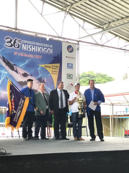 Página Inicial Dia a Dia André Barbizan conquista título na 36ª Exposição de Carpas Esquerda para direita Eu Leonardo Yoshio Miyashiro Diretor Institucional com a bandeira campeão geral, Bernie Woollands Presidente André Palumbo e Diretor Gilberto Luís Fregnani Jr.