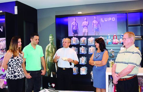 Padre Munhoz abençoando as instalações, ao lado do casal Sabrina e Samuel, da empresária Vera Maria e de Luiz Antônio Caetano, pai de Sabrina