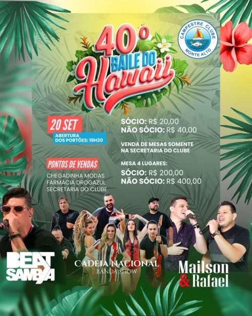 O Campestre Clube de Monte Alto promove, neste sábado, 20, a 40ª edição do tradicional Baile do Hawaii, um dos eventos mais aguardados do calendário social da cidade. A diretoria do clube afirma estar preparando a festa com muito cuidado para receber os associados e visitantes.