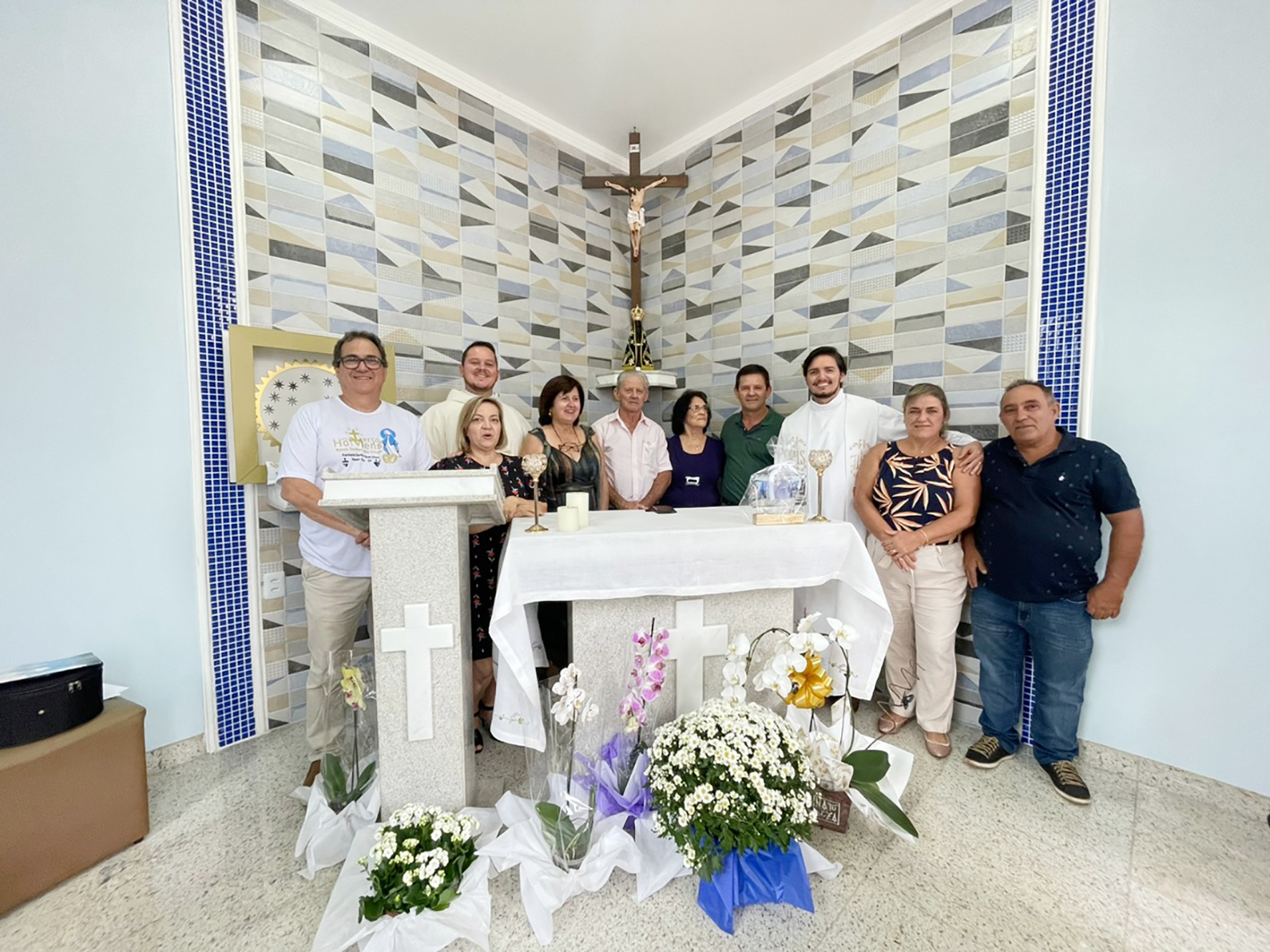 O coordenador da Casa Vovô Antonio em Monte Alto, Roberval de Oliveira, sua esposa Cláudia, Padre Luiz Gustavo, D. Sirlene, fundadora da Casa, o doador Roberto Salvador, a esposa Ana e o filho Robertinho, Padre Tulio, o voluntário Edmir Gonçalves e sua esposa Silvia