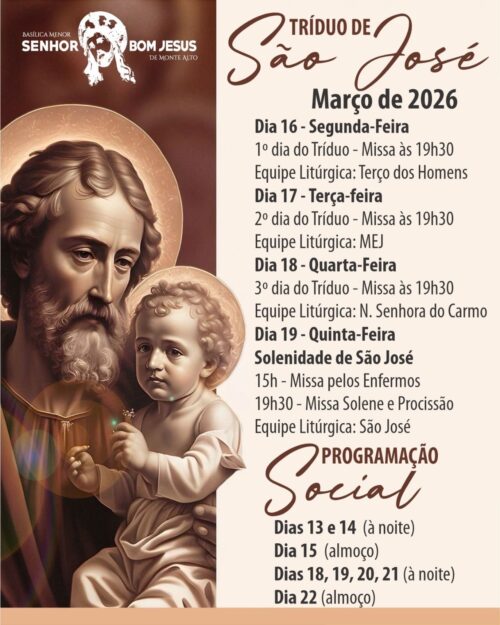 No dia 19 de março, quando a Igreja Católica celebra São José – exemplo de pai, trabalhador e homem justo, a programação religiosa contará com Missa pelos Enfermos às 15h e Missa Solene seguida de procissão às 19h30.