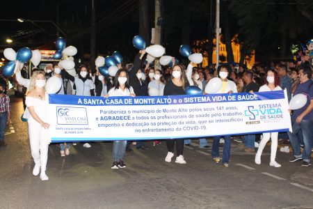 Em blocos organizados, os participantes do desfile desceram a rua central parabenizando Monte Alto com faixas e apresentações: Gaioleiros, Correia Produções, Fanfarra Integrada Anglo/Apae, idosos do Lar São Vicente de Paulo, que vieram de trenzinho; EMEBs, Escolas Municipais de Ensino Fundamental, Escolas estaduais e particulares, Rainha e Princesas do Rodeio, Santa Casa, Unimed e SAMU – em homenagem aos profissionais de Saúde que não mediram esforços na luta contra a Covid; Desbravadores e banda; Brigada de Incêndio; novos Guardas Civis Municipais; Projetos de Dança e de Esporte, Conselho Tutelar; Sabesp, e na parte musical, banda Centopeia (esta de Jaboticabal) e bloco Macaco Albino, que encerrou com chave de ouro, tocando para todos na Praça ao final.