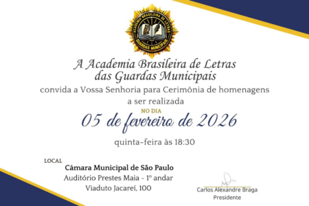 Formado em Direito e Gestão Pública, João Pereira atuou por 29 anos como Guarda Civil Municipal, carreira da qual se aposentou, e atualmente exerce o cargo de secretário municipal de Segurança Pública de Monte Alto (SP). Autor de nove livros publicados, ele também integra a Academia Mundial de Letras da Humanidade (AMLH), onde ocupa a Cadeira nº 21. A cerimônia é aberta a convidados e representa um marco na valorização da produção literária vinculada à segurança pública e à história institucional das Guardas Municipais no país.