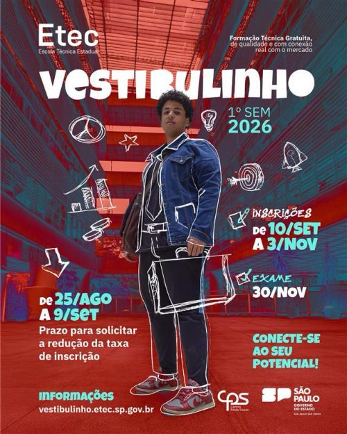 Na última segunda-feira, o Centro Paula Souza (CPS) deu início ao período para solicitação de redução de 50% na taxa de inscrição do Vestibulinho das Escolas Técnicas Estaduais (Etecs) para o primeiro semestre de 2026. Os interessados têm até o dia 9 de setembro para fazer o pedido, exclusivamente pelo site vestibulinho.etec.sp.gov.br. O valor integral da taxa é de R$ 29.