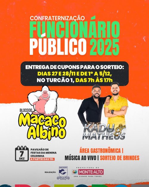 A Prefeitura de Monte Alto, em parceria com o Sindicato dos Servidores Públicos Municipais, promove neste domingo, 7, a partir das 11 horas, a tradicional festa de final de ano para os funcionários públicos municipais.
