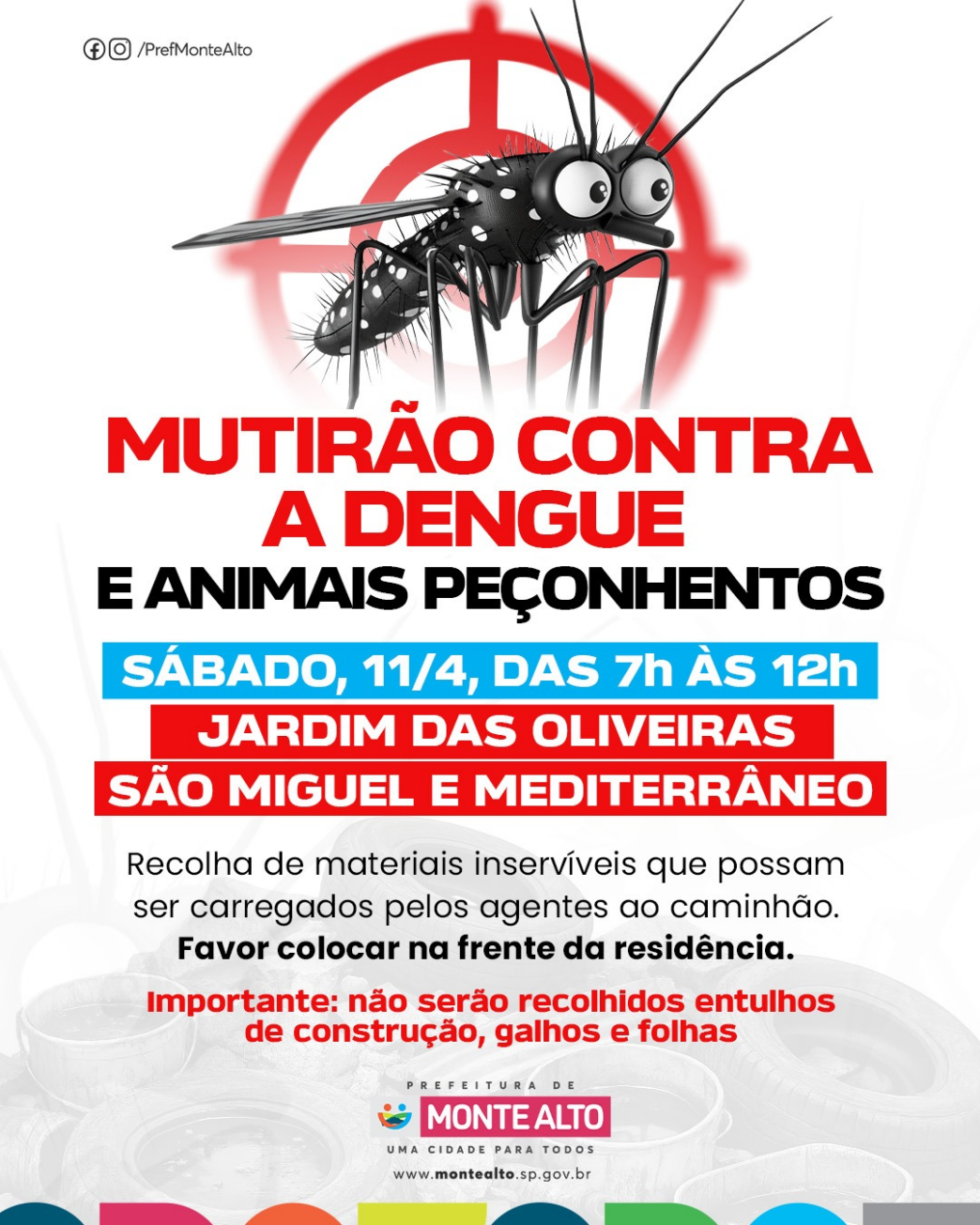 A Prefeitura de Monte Alto realiza neste sábado, 11 de abril, mais uma etapa do Mutirão contra a Dengue em Monte Alto. A iniciativa tem como objetivo intensificar o combate ao mosquito Aedes aegypti, responsável pela transmissão da dengue, zika e chikungunya.