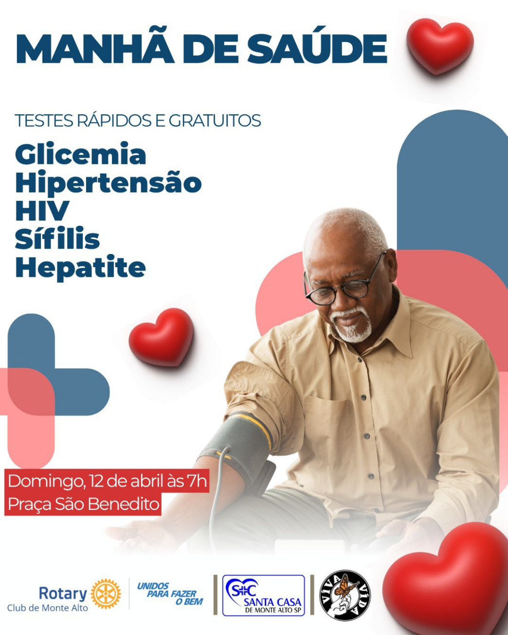 Durante o evento, serão oferecidos testes rápidos e gratuitos de glicemia, hipertensão, HIV, sífilis e hepatite, facilitando o acesso da comunidade a serviços essenciais de saúde.