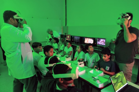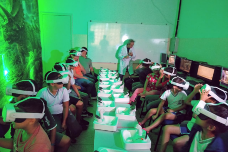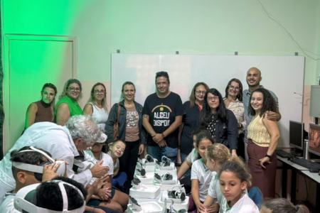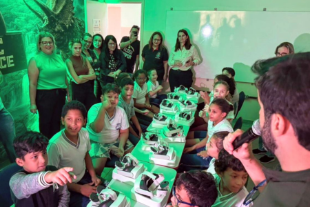 Com o uso dos óculos Meta Quest 3, estudantes do distrito de Aparecida tiveram contato com a tecnologia 3D e exploraram diferentes ambientes habitados pelos dinos, como cavernas, florestas e até um “voo” nas costas de um pterossauro.
