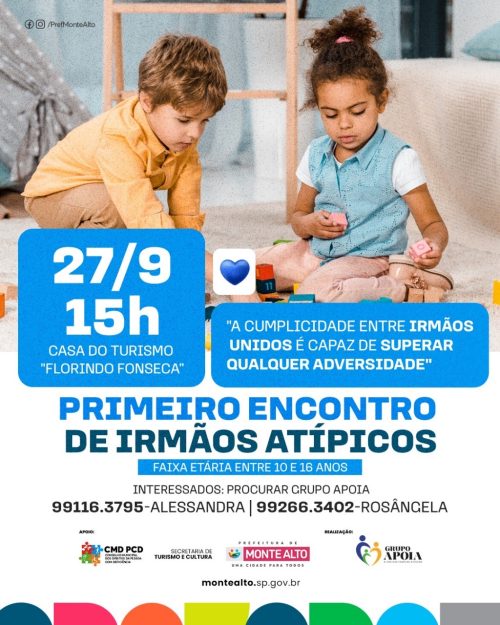 No dia 27 de setembro, Monte Alto sedia, pela primeira vez, o Encontro de Irmãos Atípicos, promovido pelo Grupo Apoia. Voltado a crianças e adolescentes de 10 a 16 anos que convivem com irmãos com deficiência, o evento será realizado às 15h, na Casa do Turismo “Florindo Fonseca”.