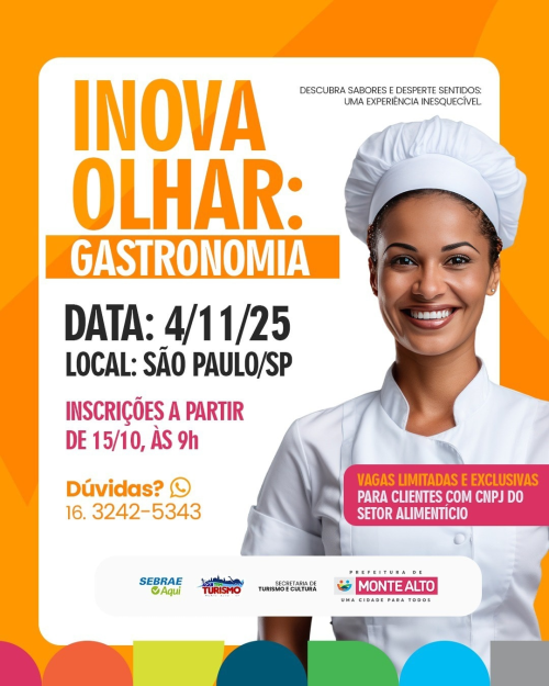A Prefeitura de Monte Alto, em parceria com o Sebrae Aqui, está convidando empreendedores do setor de alimentação para participar do programa Inova Olhar, que será realizado no próximo dia 4 de novembro, na cidade de São Paulo.