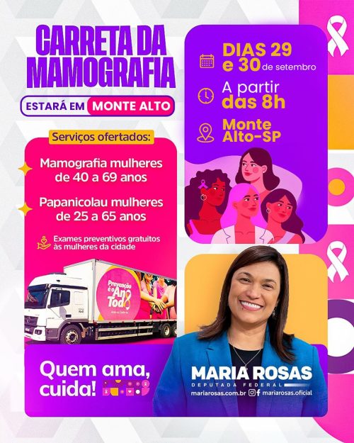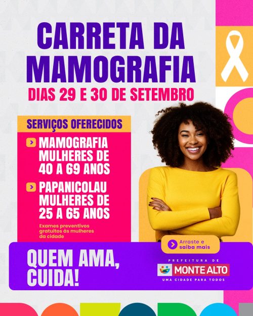 Em setembro, Monte Alto receberá a Carreta da Mamografia, uma iniciativa promovida pela parceria entre a Prefeitura e o Hospital do Amor de Barretos com o objetivo de diagnosticar precocemente os cânceres de mama e colo de útero.