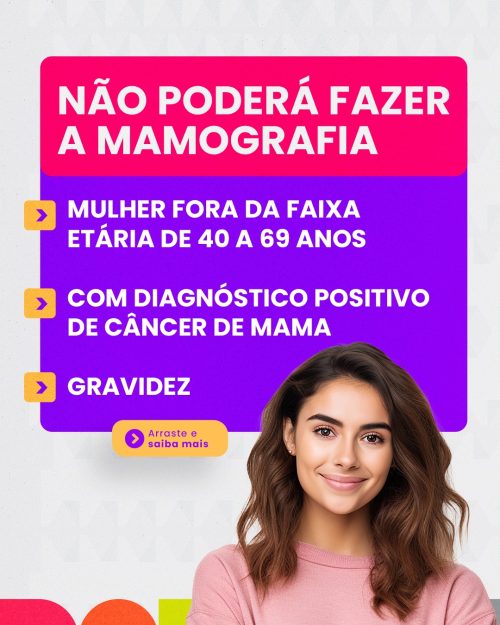 Já para a mamografia, o exame é restrito a mulheres entre 40 e 69 anos. Ficam excluídas da triagem mulheres grávidas ou com diagnóstico positivo de câncer de mama.