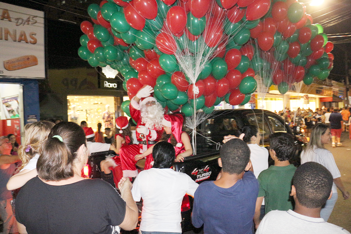 Papai Noel e as Mamães Noeis Maria Clara e Ana Clara desceram em carreata pela rua Nhonhô Livramento