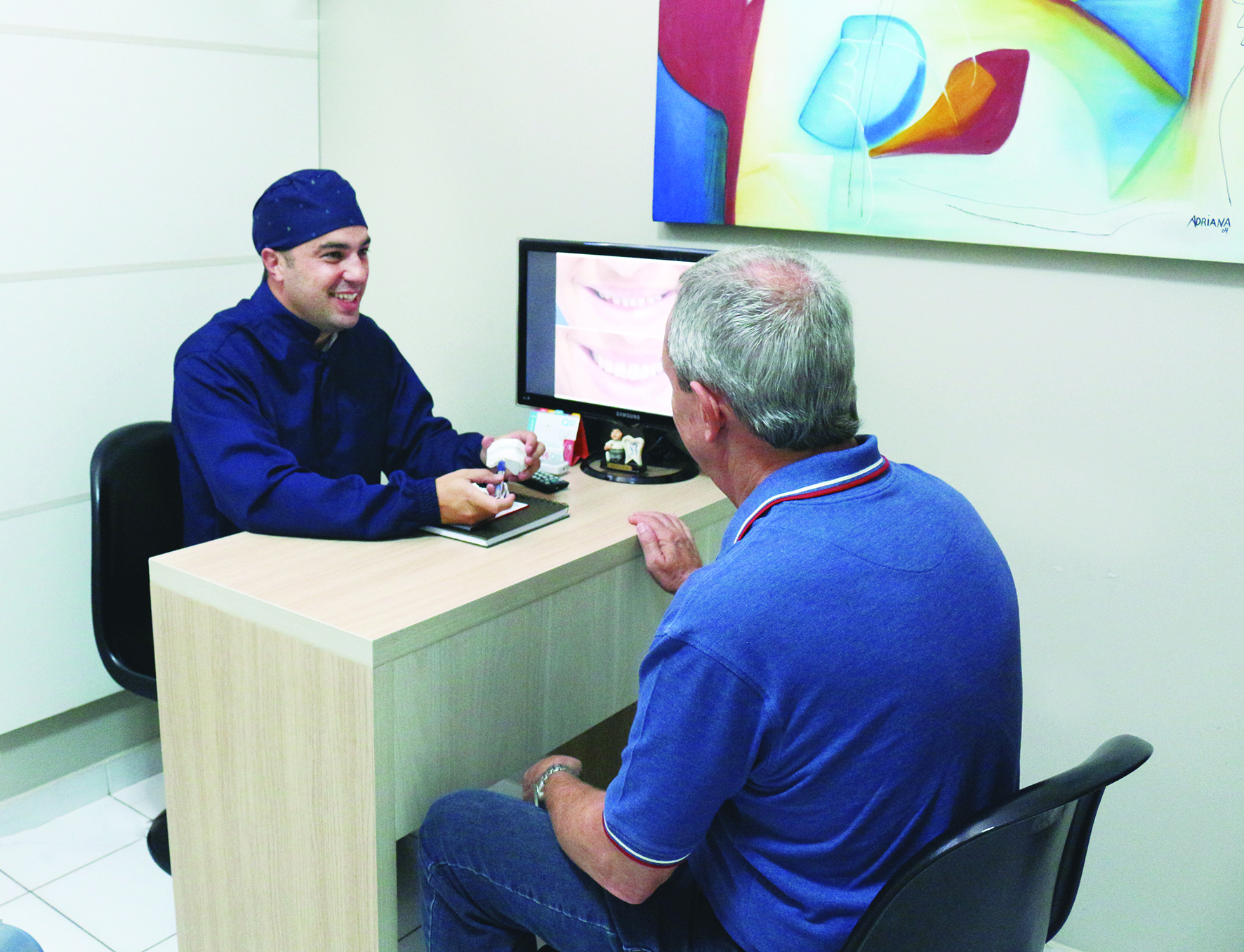 Dr. Rafael explica a um de seus pacientes os benefícios das modernas Lentes de Contato Dental: sorriso perfeito e harmonioso
