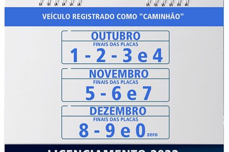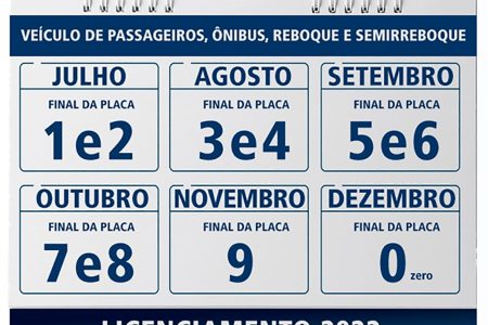 O novo calendário do licenciamento anual obrigatório conta com mudanças nos prazos para 2022. O cronograma foi definido pelo Departamento Estadual de Trânsito de São Paulo (Detran-SP) e baseado no final das placas dos veículos, porém com início a partir de julho. Por exemplo: donos de veículos com placas terminadas em 1 e 2 devem regularizar a documentação até o dia 31 de julho de 2022. O calendário vai de julho a dezembro – exceto para caminhões e tratores, que têm prazos entre outubro e dezembro.