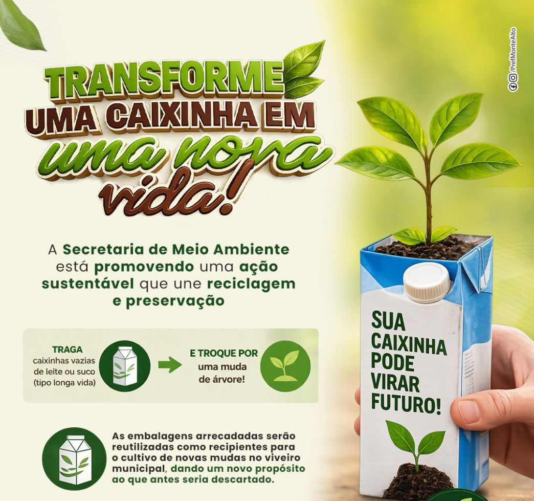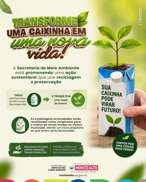 A Prefeitura de Monte Alto, por meio da Secretaria de Agricultura e Meio Ambiente, está promovendo uma ação que une sustentabilidade, reciclagem e preservação ambiental. A iniciativa convida a população a participar de uma troca consciente: embalagens vazias de leite ou suco, do tipo longa vida, podem ser entregues em troca de mudas de árvores.