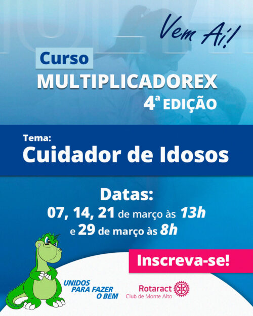 Estão abertas as inscrições para a 4ª edição do Curso Multiplicadorex, que neste ano traz como tema “Cuidador de Idosos”. Realizado pelo Rotaract Clube de Monte Alto, a iniciativa tem como objetivo capacitar pessoas interessadas em atuar no cuidado responsável, humanizado e qualificado da população idosa, segmento que cresce de forma significativa e demanda profissionais cada vez mais preparados.