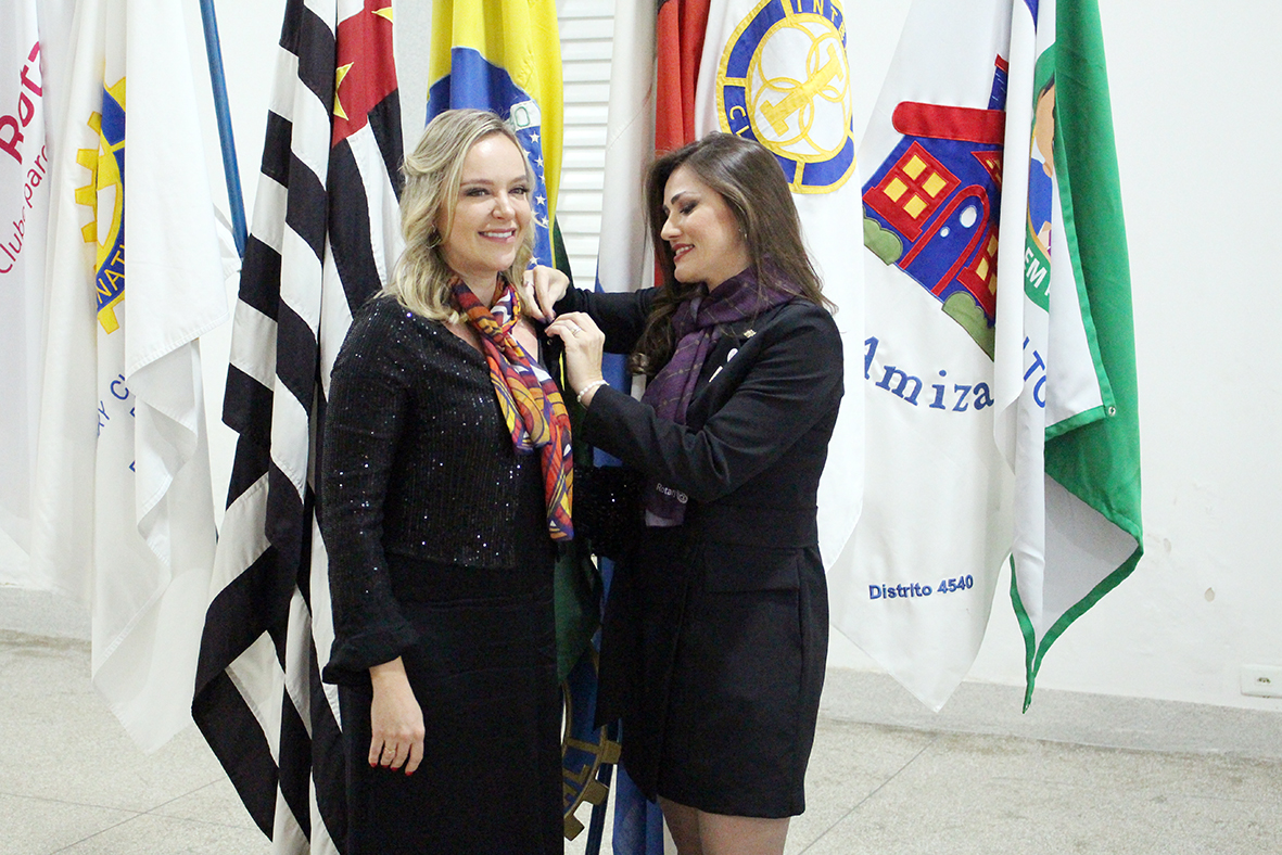 Natalie Monteiro colocou o ‘Pin’ de presidente em Janaína Ivanoff Mello, transmitindo a presidência da Casa da Amizade
