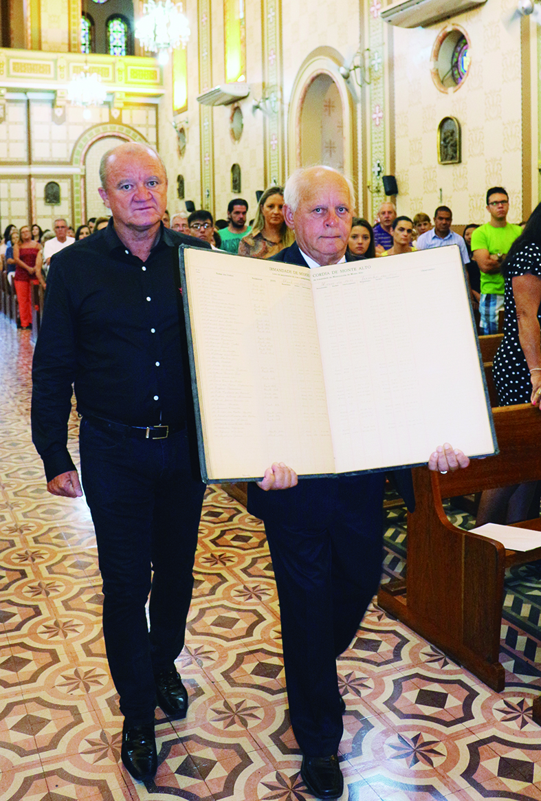 Diretores, médicos e religiosas adentram à Matriz com valiosos documentos que marcam a história da fundação da Santa Casa de Monte Alto e também, a entrada da primeira criança nascida no hospital montealtense, Izabel Toninato Zaniboni, acompanhada pela religiosa, irmã Maria Helena