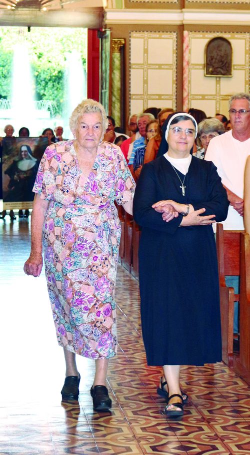 Diretores, médicos e religiosas adentram à Matriz com valiosos documentos que marcam a história da fundação da Santa Casa de Monte Alto e também, a entrada da primeira criança nascida no hospital montealtense, Izabel Toninato Zaniboni, acompanhada pela religiosa, irmã Maria Helena